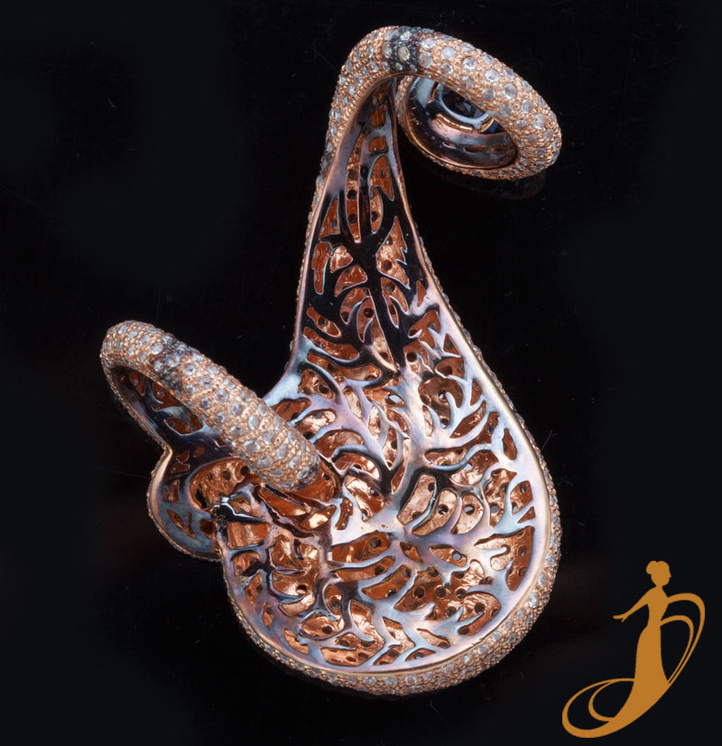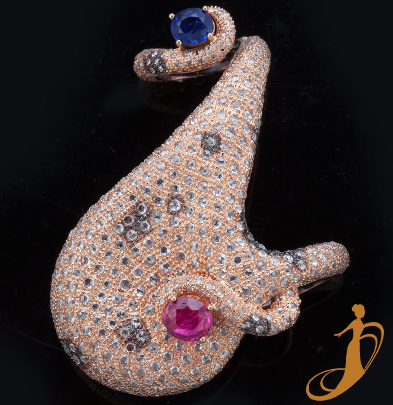This magnificent larger-than-life ring pays homage to the structure of the humble Betel leaf. It captures the moment when the season turns and the leaf begins to disintegrate. Two-and-a-half-inches in length and awash with intricate detailing, it comes inset with a total of 672 rose cut diamonds, topped and tailed with a rare natural Burmese ruby at one end and natural Burmese blue sapphire at other.