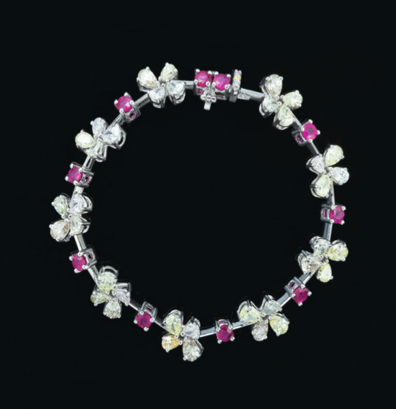 This delicate 18-carat white gold bracelet sparkles with 39 fancy colour pear and round cut diamonds in wing-like pairing interspersed with a series of 10 Burmese rubies. Whimsical, fun and evocative of the spring, the bracelet is inspired by a series of paintings by the artist Vincent van Gogh entitled “Butterflies” that symbolises transformation, freedom and life.
