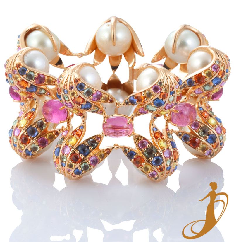 The magnificent fan vaulting of the great Cloister & the amazing stained glass work of the Gloucester cathedral are at the soul of the magnificent bracelet finished off with enormous south sea pearls
