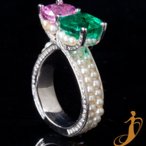 The spirit of Park Guell, particularly the vivid colours of the park’s striking Mosaic Pathway, is recreated here. Emulating the Trencadis technique that Gaudi used, these larger than life earrings substitute recycled ceramic chips with a mix of diamonds and multi colour sapphires. The reverse side of the earrings are just as detailed, inspired by the border of the seating area that overlooks the famous mosaic chameleon that sits at the entrance to the park.